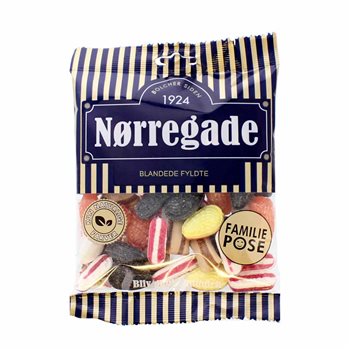 Nørregade Blandede Fyldte is, in the most literal sense, tradition and history boiled down to a bag of irresistible candies. Since 1924, Nørregade has produced candies, and this mix only contains filled candies in several different flavours. Try, for example, Schweizerdrops, which are filled with chocolate. Good to have in the car or in the bag.