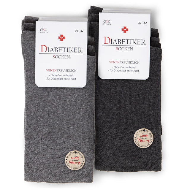 Our diabetic socks are made from a classic cotton-polyester blend. The best properties of both materials, such as the comfort and moisture behavior of cotton, are combined with the breathability and durability of polyester. Elastane makes the material additionally stretchy and ensures a comfortable fit and therefore a pleasant wearing experience - all day long. SOFT AND SKIN-FRIENDLY, SUITABLE FOR DIABETIC SUFFERERS: We deliberately avoid pressing seams and a tight elastic waistband in these health socks. This makes the socks particularly vein-friendly and ideal for diabetics. A high cotton content also ensures a pleasant foot climate and high wearing comfort.YOUR FIRST CHOICE FOR... increased comfort requirements, sensitive tissue or people with arterial circulatory disorders.DESIGN FROM GERMANY - MADE IN EUROPE: Our products are manufactured exclusively in modern factories in Europe. This is the only way we can guarantee that our goods are produced in compliance with European standards regarding working conditions, environmental protection, safety and fair wages. The product is designed at our headquarters in southern Germany.12 MONTH WORRY-FREE GUARANTEE: Regardless of whether there is something wrong with the product or it simply does not meet your expectations, we guarantee you a free exchange during the first 12 months.