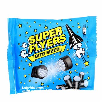 La bolsa de bocados de Super Flyers de Nestlé contiene los populares súper volantes en pequeños bocados solo para aparecer en la boca. Los pequeños bares armonizan extremadamente bien entre salado y dulce con un caparazón de regaliz suave y un crujiente contenido de azúcar.
