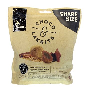 La liquirizia Choco del produttore finlandese di caramelle Panda sono deliziose palline costituite da liquirizia salata ricoperta di cioccolato al latte e arrotolato in polvere di liquirizia, che offre una squisita combinazione di sapori di salmiak e dolce. Qui in una grande borsa azionaria di 330 grammi.