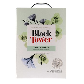 Black Tower Fruity White è un vino bianco dolce dalla Germania. Il vino ha un gusto fruttato e aromi di miele, mele e pere. Il vino può essere servito come drink di benvenuto, con antipasti affumicati e con dessert. Black Tower è stata il marchio tedesco più popolare negli ultimi 40 anni. Il vino è una borsa da 3 litri in scatola e ha un contenuto di alcol del 10%.
