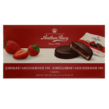 Anthon Berg er spesialister innen likørfylte sjokolade, og denne typen sjokolade er bedre kjent som en marzipan-terte. Som navnet antyder, inneholder denne marzipan -terte deilige jordbær dyppet i glitrende vin, og hele herligheten er endelig belagt med mørk sjokolade fra Anthon Berg for å danne den ultimate akkompagnementet til kaffen.