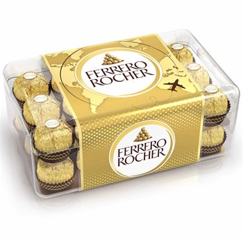 De velkjente sjokoladekulene i den gyldne emballasjen fra Ferrero. I denne store boksen er det ikke mindre enn 30 stykker av de deilige Rocher -sjokolade, som består av en hel, stekt hasselnøtt og myk sjokoladekrem, i en ball med sprø vaffel, belagt med sjokolade og små biter av stekt hasselnøtter, som gir En fantastisk smakopplevelse.