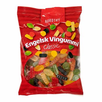 Klassikeren av dem alle, engelsk vinkummi, er her i en pose på 900 g fra det nordlige merket. Det er fylt med myke og søte vin tannkjøtt, som er en virkelig vinner for moro på fredag - eller mandag moro for den saks skyld
