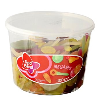 În această găleată primiți o mulțime de bomboane pentru bani. Red Band Megamix conține 1,3 kg gummies de vin sub formă de taste, monede, picioare și zâmbete. Când ați bătut o piesă, puteți închide din nou găleata, astfel încât lingele să -și păstreze gustul.