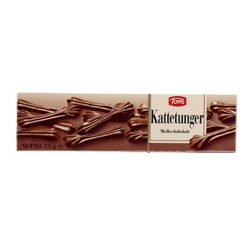 En mycket välkänd dessertchoklad, Toms Kattetunger. Lådan innehåller lätt choklad som smälter på tungan och förför med sin vackra smak. Toms har alltid varit en garant för förstklassig choklad, vilket också är fallet med kattens tungor. Tjäna till exempel choklad som ett ackompanjemang till en god kopp kaffe.