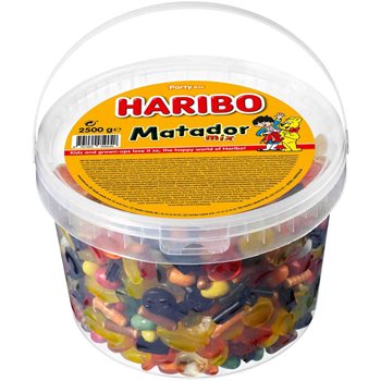 Haribo Matador-mix är en av nu välkänd blandning som består av både vinfummar och lakrits. Haribo är känd för godisen som de har producerat i otaliga sorter. Här får du en stor hink med en enorm 2,5 kg.