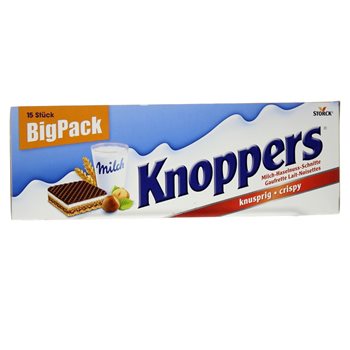 Ett stort paket med Knoppers med 15 st. av det krispiga mellanmålet. Skivorna väger 25 g vardera och är praktiska att ta på språng eller som en läcker överraskning i en fullsatt lunch. De skiktade snacks består av våffla med mjölkkräm och hasselnöt nougat grädde.